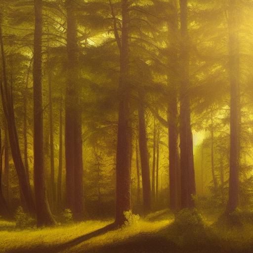 A painting of various trees in a forest
