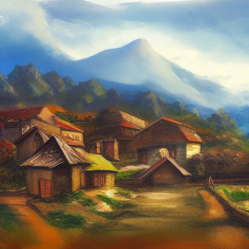 Finally, the fifth part of the prompt, “distant village background,” provides specific guidance on the composition of the image. This suggests that the image should show the village in the foreground, while the background should depict other distant villages or elements that add depth and interest to the image.