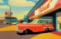 Painting of a retro car parked in front of a starlite diner