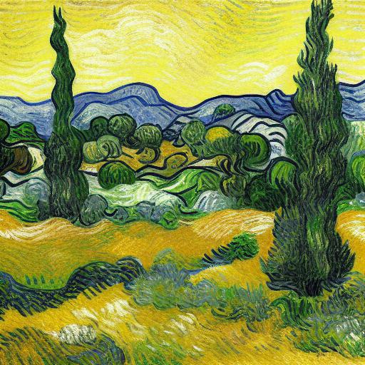 Finally, the prompt includes several keywords related to the subject matter and style of the image, including “cypresses and hills,” “cypresses,” and “Van Gogh painting.” These keywords help to guide the AI image generation process and ensure that the resulting image captures the essence of the prompt.