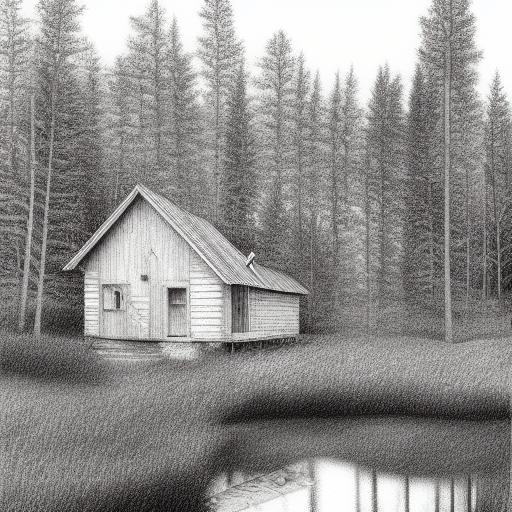 Pencil drawing of a cabin near a lake
