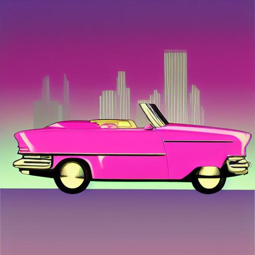 Retro pink car driving down the street at night