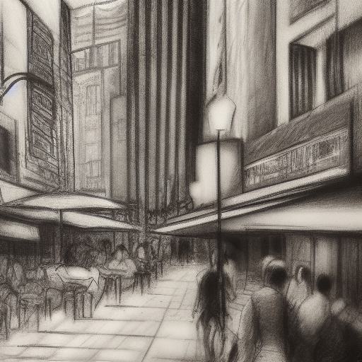 A black and white Charcoal drawing of a soothing city street with restaurant and bar