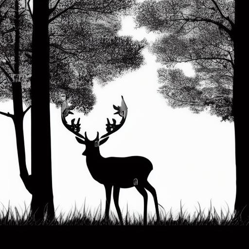 A black and white silhouette of two deer in a forest