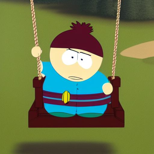 A cartoon character is sitting on a swing inspired by Richard Pionk