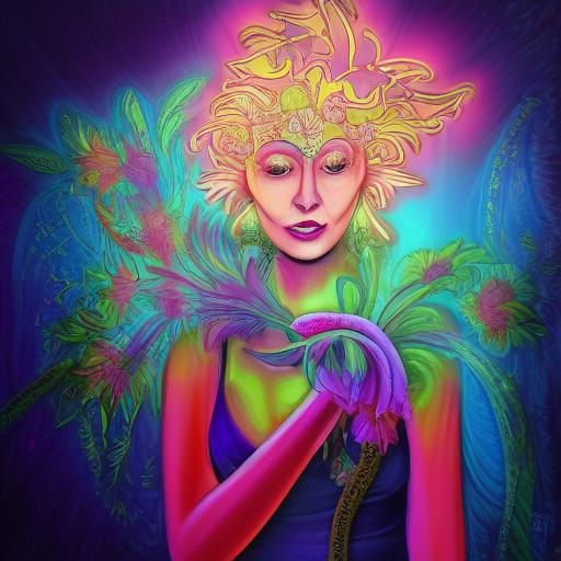 About A digital 2D fantasy psychedelic artwork painting of a woman holding a laughing flower