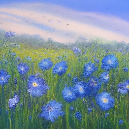 A painting of a bunch of blue flowers in a field