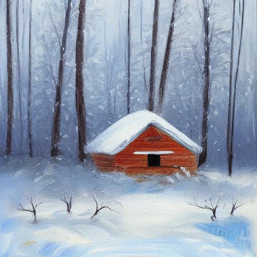 A painting of a small house in a snowy forest in winter
