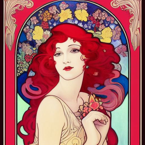When generating an AI image, the prompt serves as a guide to steer the AI towards creating a specific artwork. Let’s explore the prompt “A painting of a woman with flowers in her red hair, an Art Deco painting inspired by Alphonse Mucha, Art Nouveau, Raphaelite and Alphonse Mucha, elegant long dress, flower, portrait, complicated pattern” in more detail: