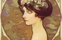 a painting of a woman with ribbon in her hair, an art nouveau painting, alsphonse mucha, elegant, artistic, plants, flowers