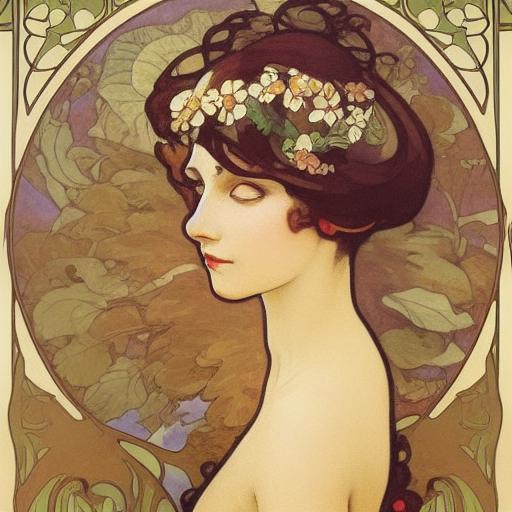 To start, the prompt includes the general concept of a painting of a woman. The addition of a ribbon in her hair and the reference to Art Nouveau style already begin to give a more specific idea of what the image might look like. The mention of Alphonse Mucha, a well-known Art Nouveau artist, further clarifies the desired style and aesthetic.