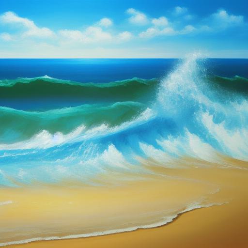 A painting of sea and beach with blue sky