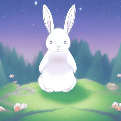 A peaceful white rabbit sitting in the middle of a forest at night alone