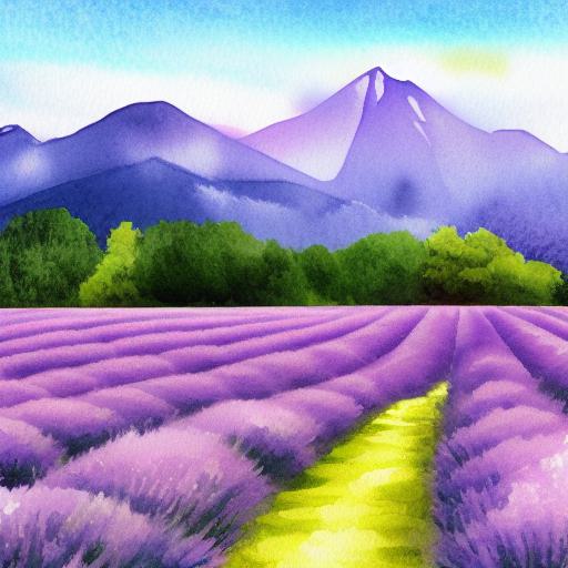 A watercolor painting of a field of lavender with a mountain in the background