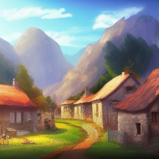 The digital painting of a small village in the mountains