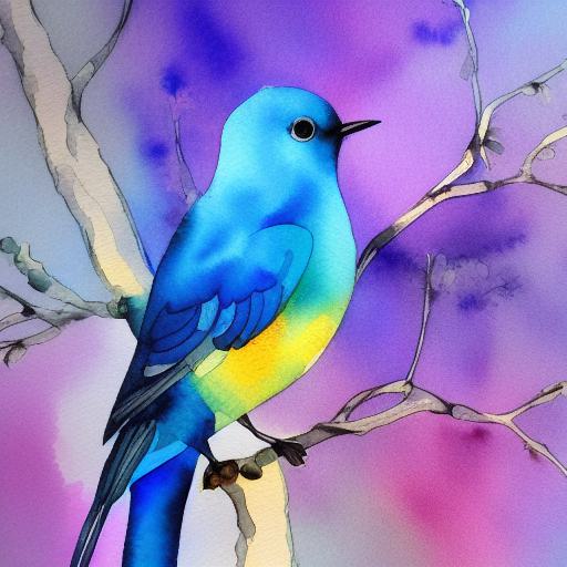 The watercolor painting of a blue bird sitting on branch