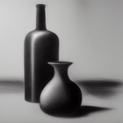 A black and white charcoal drawing of two vases and a bottle