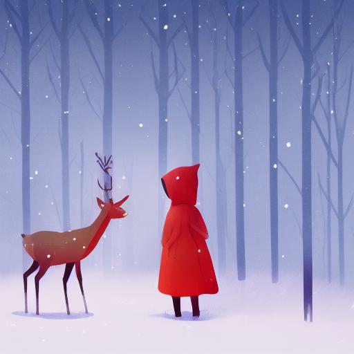 A little girl with red hood facing backward standing next to a deer in winter a storybook illustration inspired by Pascale Campion