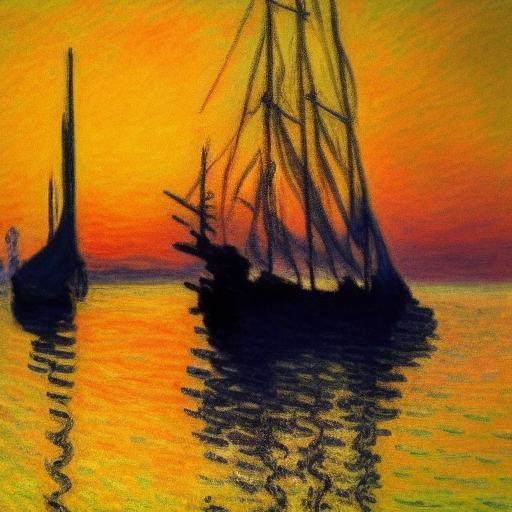 A melancholic painting of a giant boat in a body of water at sunset