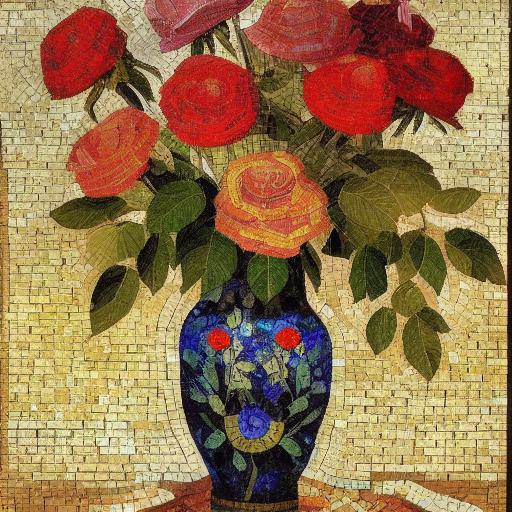 A mosaic painting of roses in a vase inspired by Mikhail Vrubel