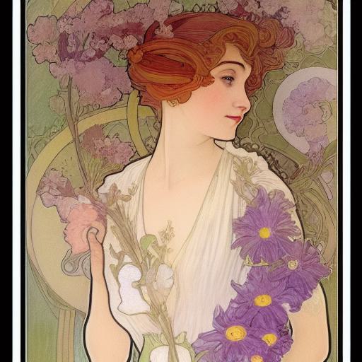 Here’s a description based on the prompt “a painting of a woman, holding flowers, wearing long dresses, painting inspired by Alphonse Mucha, art nouveau, modern art nouveau, elegant, flat“: