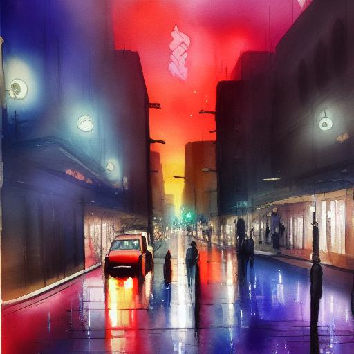 A painting of city street with lights