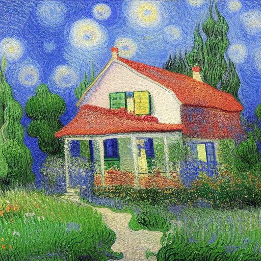 A painting of the house in a garden with flowers