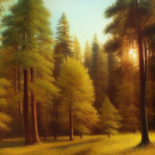 A painting of various trees in a forest with grassland