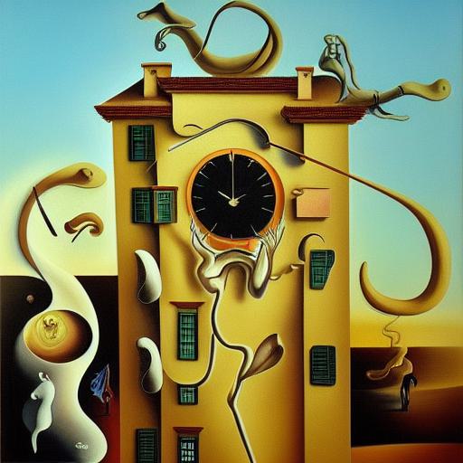A painting on the side of a building with a curvy clock