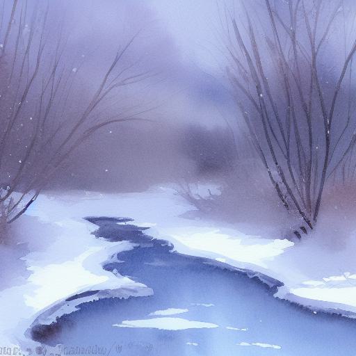 A tranquil watercolor painting of snow-covered trees and a stream on a snowing day