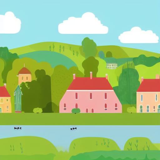 An illustration of a town with houses and trees in the background