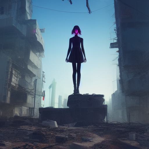 3. “A girl standing on top of a pile of rubble” – This provides a specific visual element that the AI can focus on. The girl and the rubble suggest that the image takes place in a post-apocalyptic setting and gives the AI a specific subject to work with.