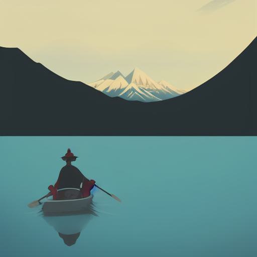 One man on the boat on a lake with mountains in the background