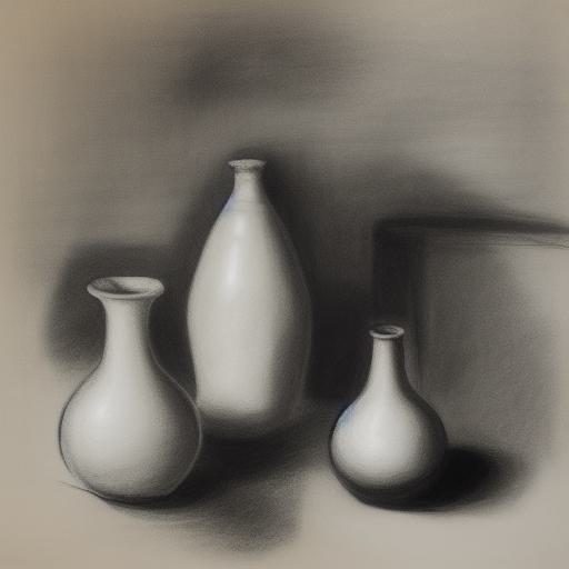 The black and white drawing of two vases and a bottle
