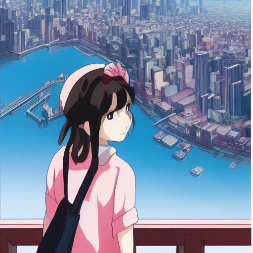• This enchanting anime portrait from Studio Ghibli portrays a school girl in front of the vibrant Tokyo cityscape in an analog photo style. The school girl stands on a rooftop