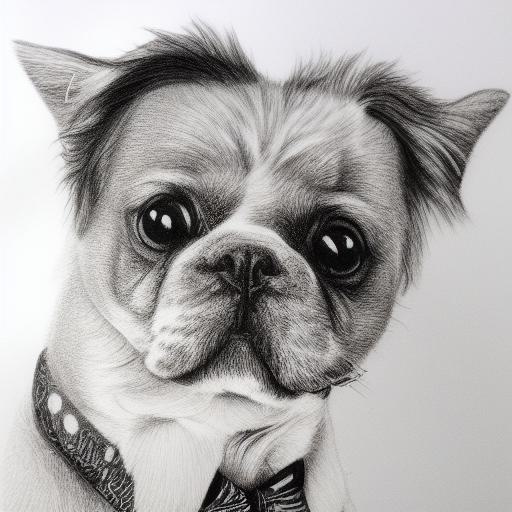 A black and white drawing of a dog wearing cute clothes