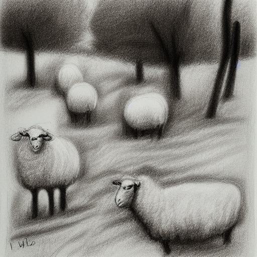 A black and white drawing of sheep and trees