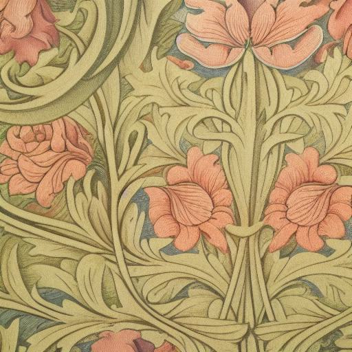 First of all, let’s take a look at the prompt, ” a close up of a pattern of flowers, a mid-nineteenth century engraving by William Morris, arts and crafts movement, acanthus, acanthus scrolls, acanthus scroll, art nouveau, sharp and light colors”. All the words included will affect the final result we gain:
