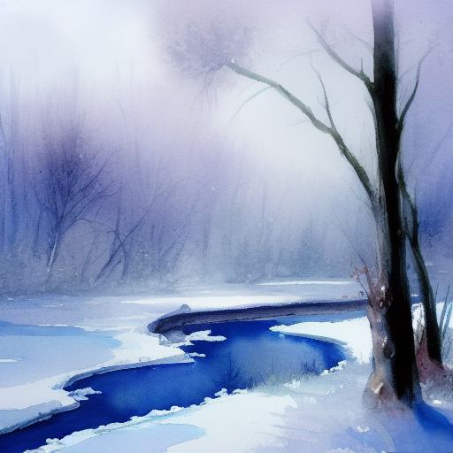 A ethereal watercolor painting of snow-covered trees and a stream on a snowing day