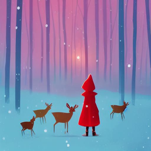 A little girl with red hood facing backward standing next to a deer in winter a storybook illustration inspired by Pascale Campion