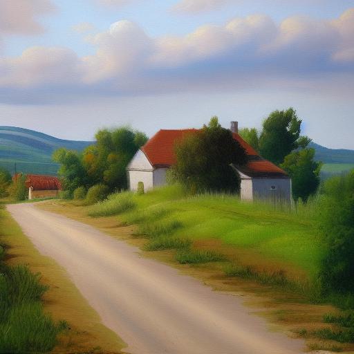 A painting of a country road with some houses