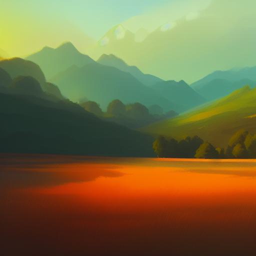 A painting of a green field with mountains under an orange sky