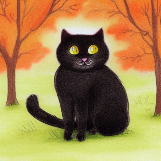 A painting of a happy black cat in the autumn forest