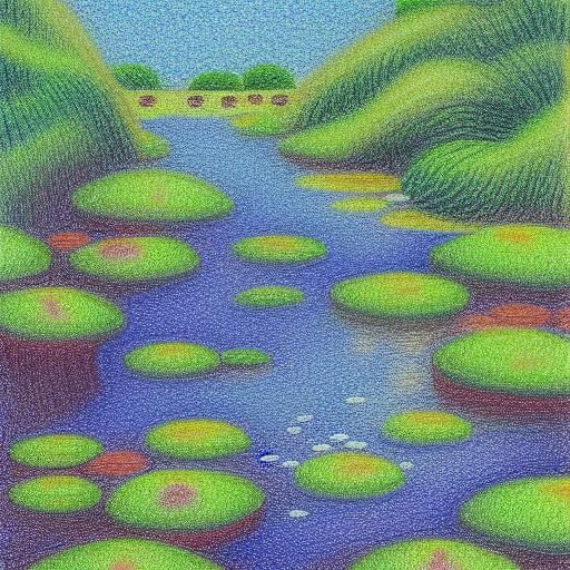 A painting of a river surrounded by lotus flowers