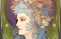 The choice of a woman with flowers in her hair is a common motif in art nouveau, and is often associated with the idea of femininity, beauty, and nature. The use of white hair in the prompt may also suggest a more mature or ethereal quality to the woman in the painting. The influence of Alfonse Mucha, a prominent figure in the art nouveau movement, suggests that the painting will feature flowing, organic lines and intricate decorative details.