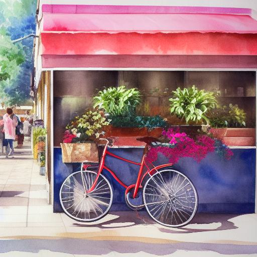 A painting of bicycle placed in front of a flower shop