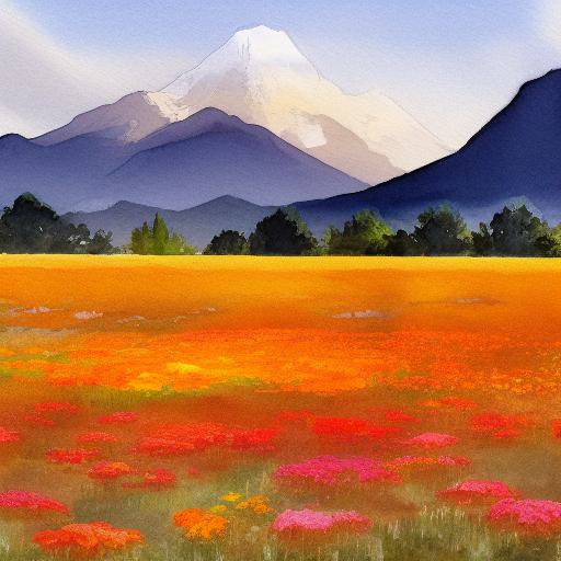 A serene watercolor painting of a field of marigolds with a mountain in the background