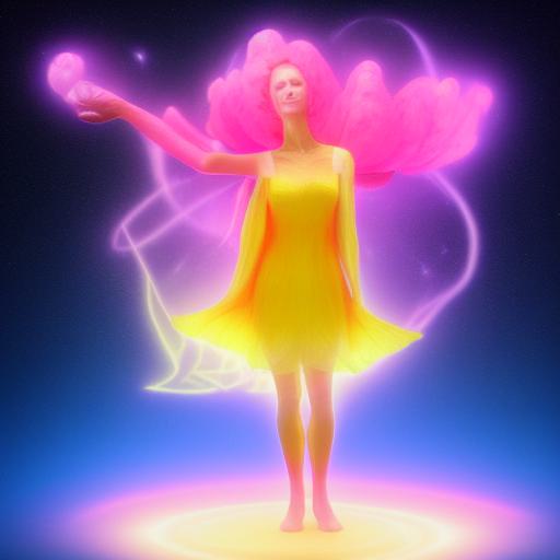 2. Character description: The woman is described as a psychedelic elf, which sets the tone for the surreal and otherworldly nature of the image. She is also holding a pink flower, which adds a pop of color to the scene.