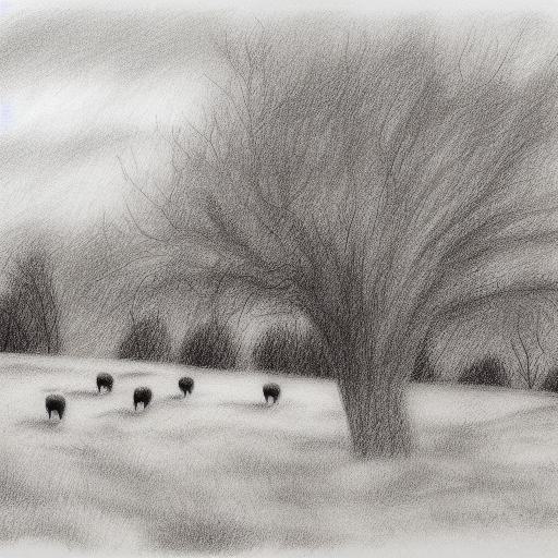 Black and white drawing of sheep and trees in rural area