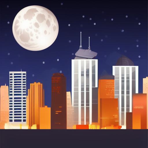City at night with a moon in the sky
